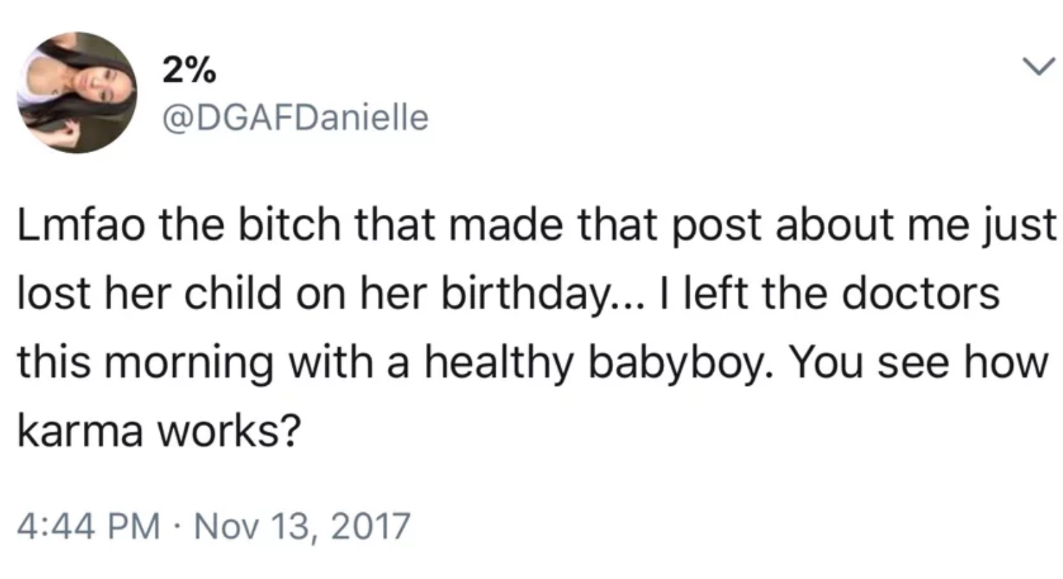 I was waiting for someone to point THAT out more than anything. Did that Tweet Me On Tuesday B**CH just celebrate the death of someones child and is on social Media bragging about her baby and talking about karma? WHAT!!!! Ohh she is in for a surprise.