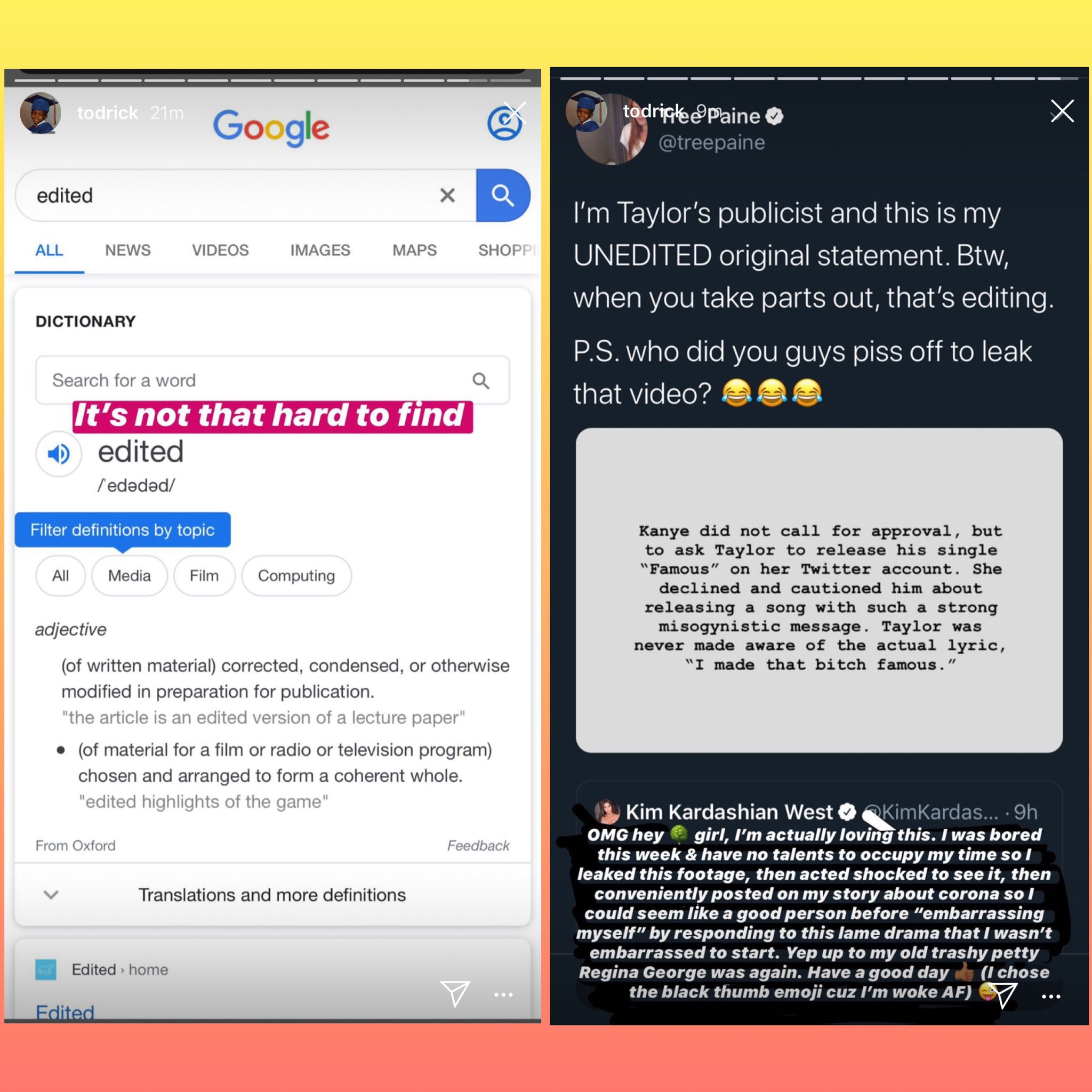 To be clear, the only issue I ever had around the situation was that Taylor lied through her publicist who stated that “Kanye never called to ask for permission…” They clearly spoke so I let you all see that. Nobody ever denied the word “bitch” was used without her permission.