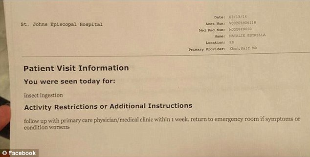 Estrella was treated at St John’s Episcopal Hospital for ‘insect ingestion,’ according to discharge papers.