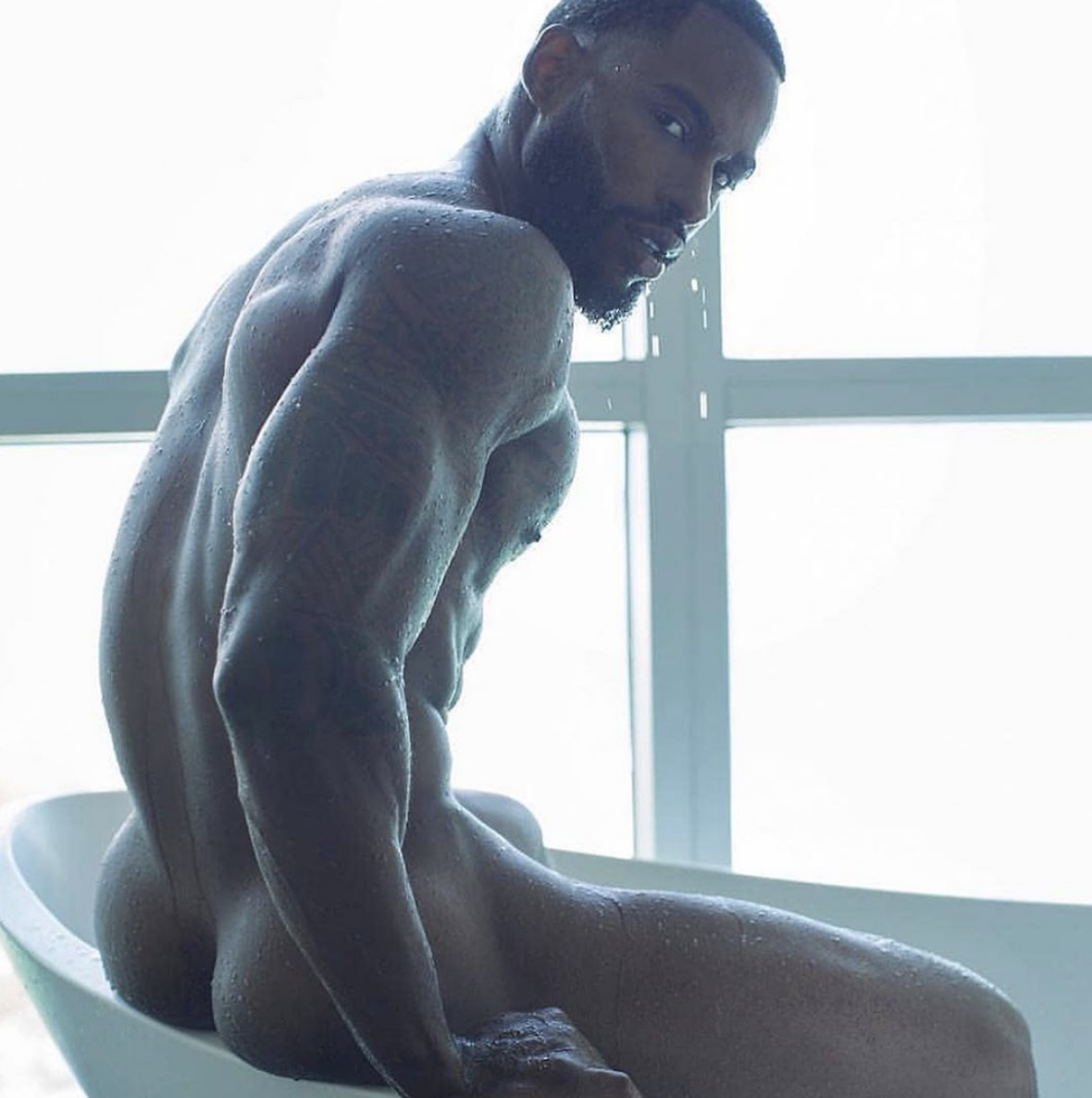 I really don’t care for beards but that’s just my personal tastes. I like em clean cut or trimmed face but in any case, he’s a nice looking man. I like the picture where he’s sitting on the edge of the tub with his legs open looking back.