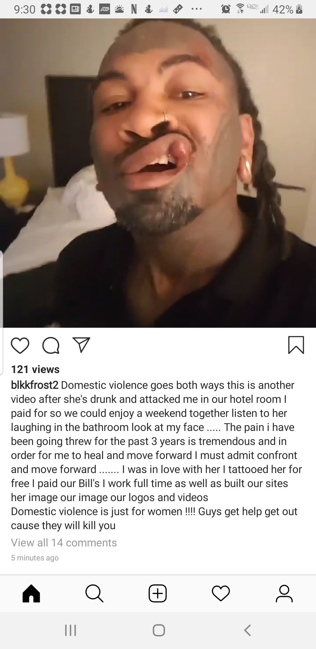 This right here is UNACCEPTABLE!!! DOMESTIC VIOLENCE against men is real!! This would have been an outrage had he been beating her but if it’s the man….it’s seen as a joke. @Blkkfrost I pray you find the strength to PRESS FULL CHARGES, LEAVE AND DIVORCE THIS TOXIC WOMAN ASAP!!! pic.twitter.com/2gBSnxRDKH