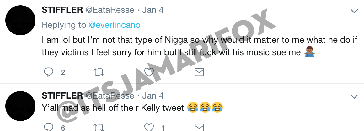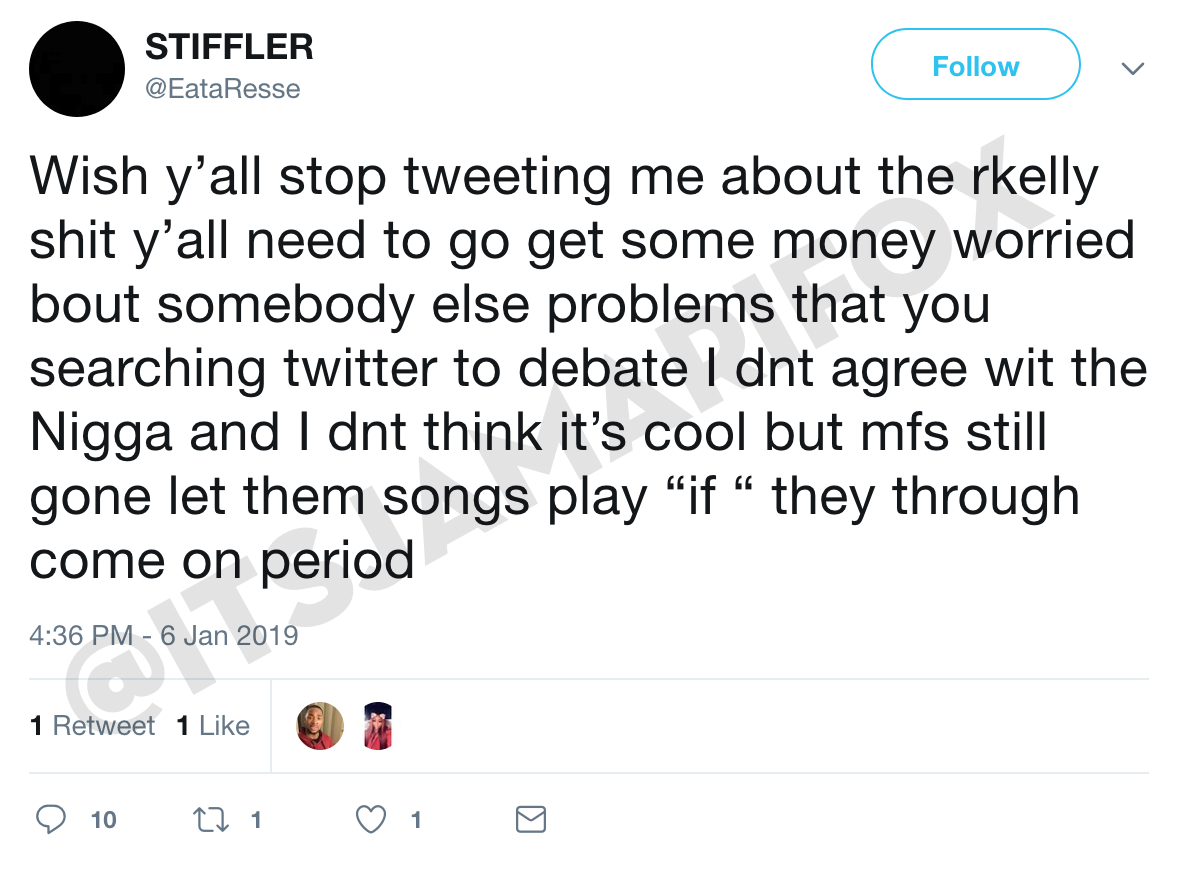 He dumb. If listening to R. Kelly’s music after finding out its about men, turns you off because you dont want to hear or imagine the lyrics, why cant the same be said for singing about an underage female? Or do u block that part out and just imagine the female part?