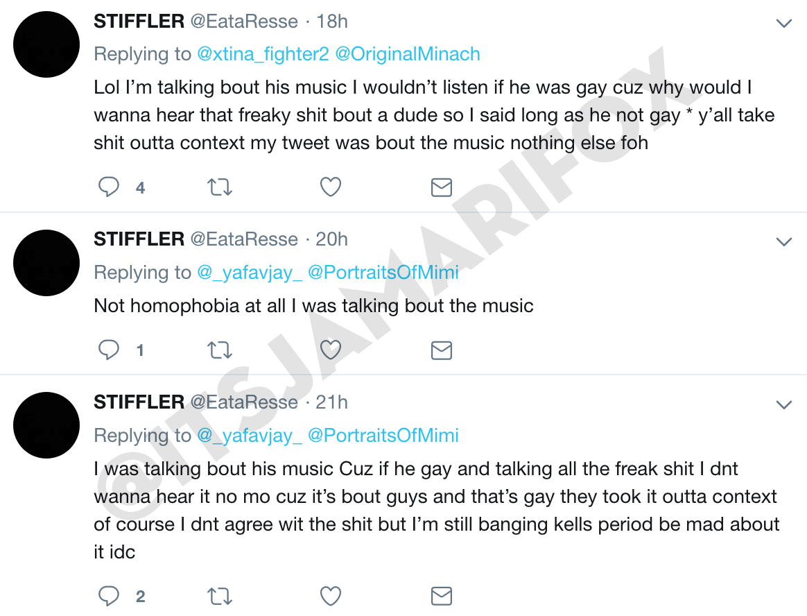 I hope this shit follows him to the end of the Earth. I cant stand homophobes and the shit they be spewing. He says R. Kelly fuckin around with lil girls ain’t got shit to do with him, he still gone listen to music. Then in the next breath says that if R. Kelly is secretly gay then he cant listen to him. How does THAT have anything to do with you either? How can you tolerate him and his pedophilia but the moment he messes around with a dude…?! Dudes like this make me sick and are mostly closeted gays and self-hating.