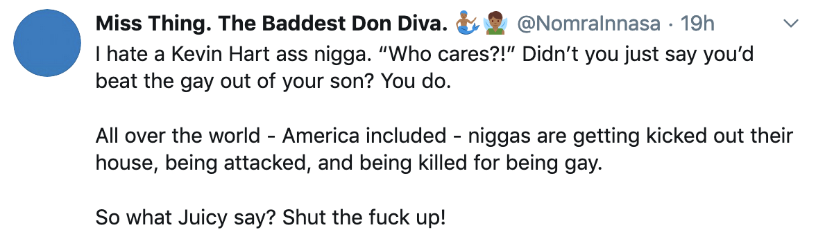 Kevin Hart is a homophobe and tried to gaslight Lil Nas X for coming out, saying what’s the big deal, like he (Kevin) didn’t know why it was a big or or anything about homophobia even though his vile@ss had said he would prevent his son from being gay and then said he would break a doll house over his son’s head if he caught him playing with. He’s made other gay jokes as well